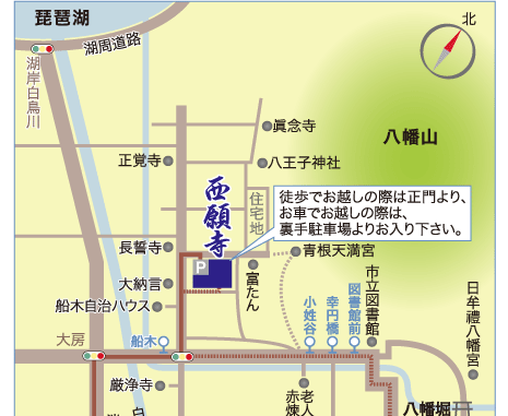 《JR琵琶湖線》 近江八幡駅下車 《近江鉄道バス》 駅前北口より野ヶ崎線乗車(7分) 船木バス停で下車 徒歩5分