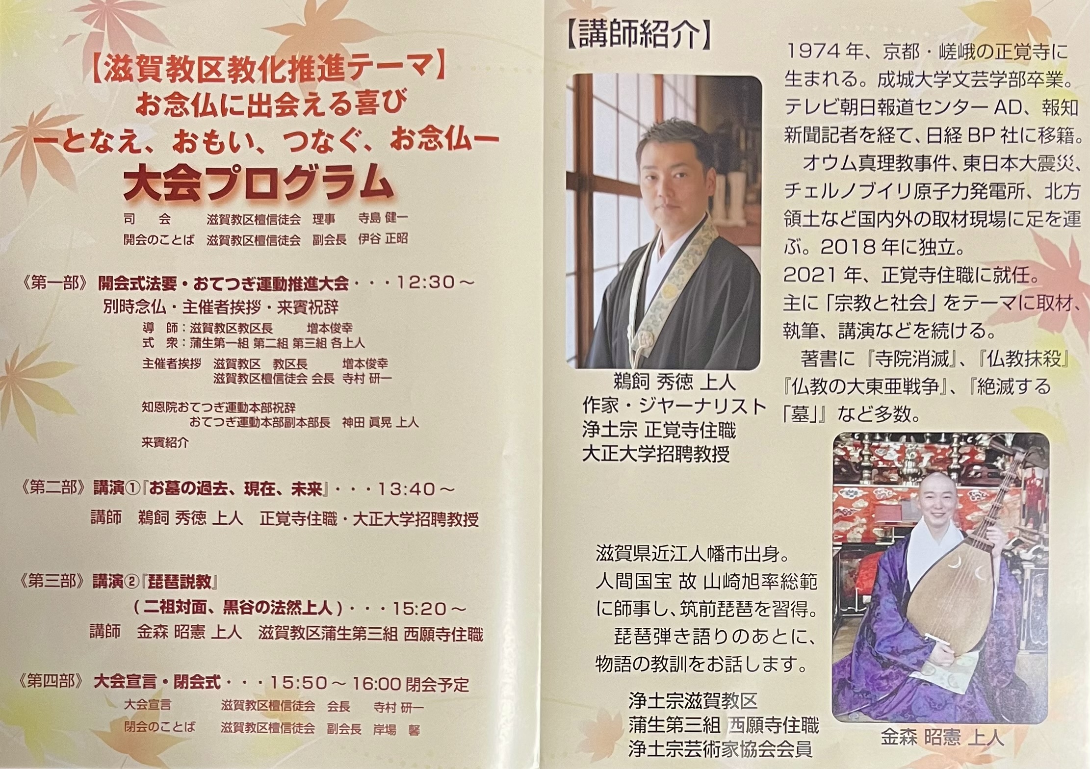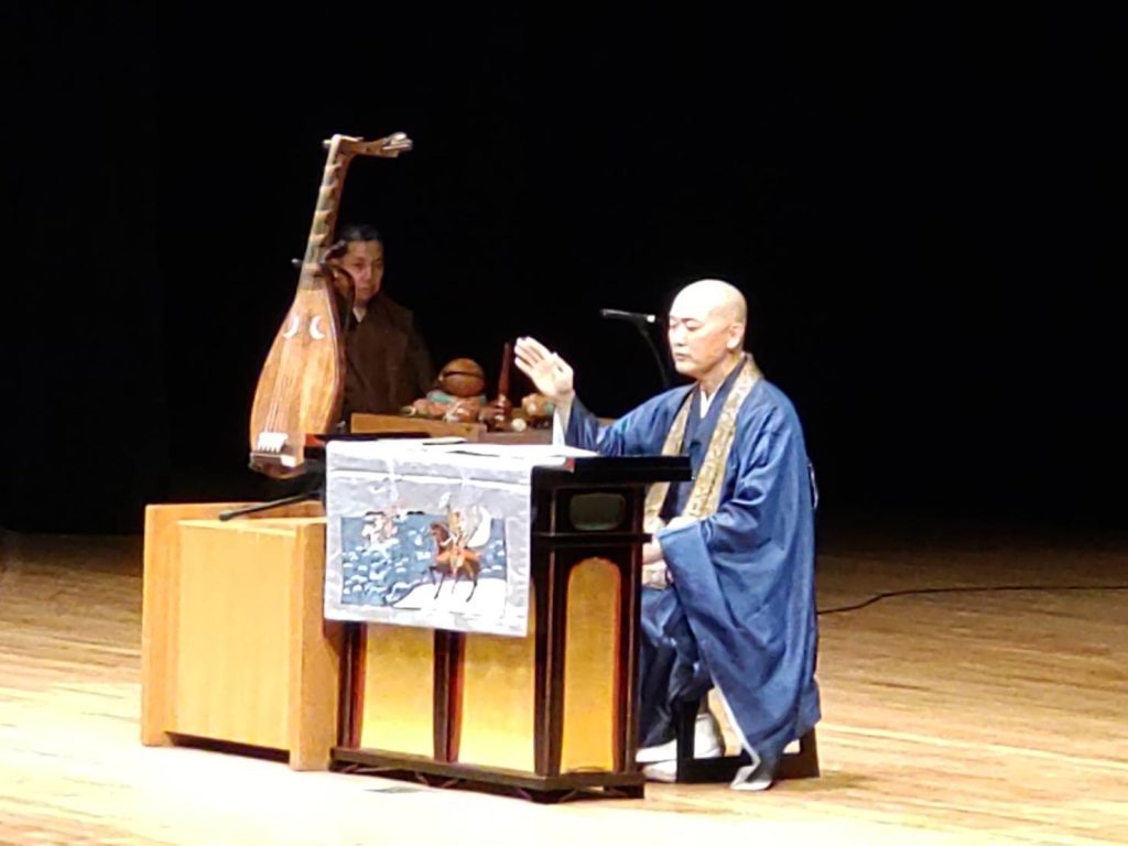 先月10月25日、滋賀県浄土宗檀信徒大会で、琵琶説教をさせていただきました。会場は、地元の近江八幡市文化会館。1000人規模の檀信徒の皆様が一堂に会する中で 自身が創作した法然上人の物語を語るというのは、感慨深いものがありました。