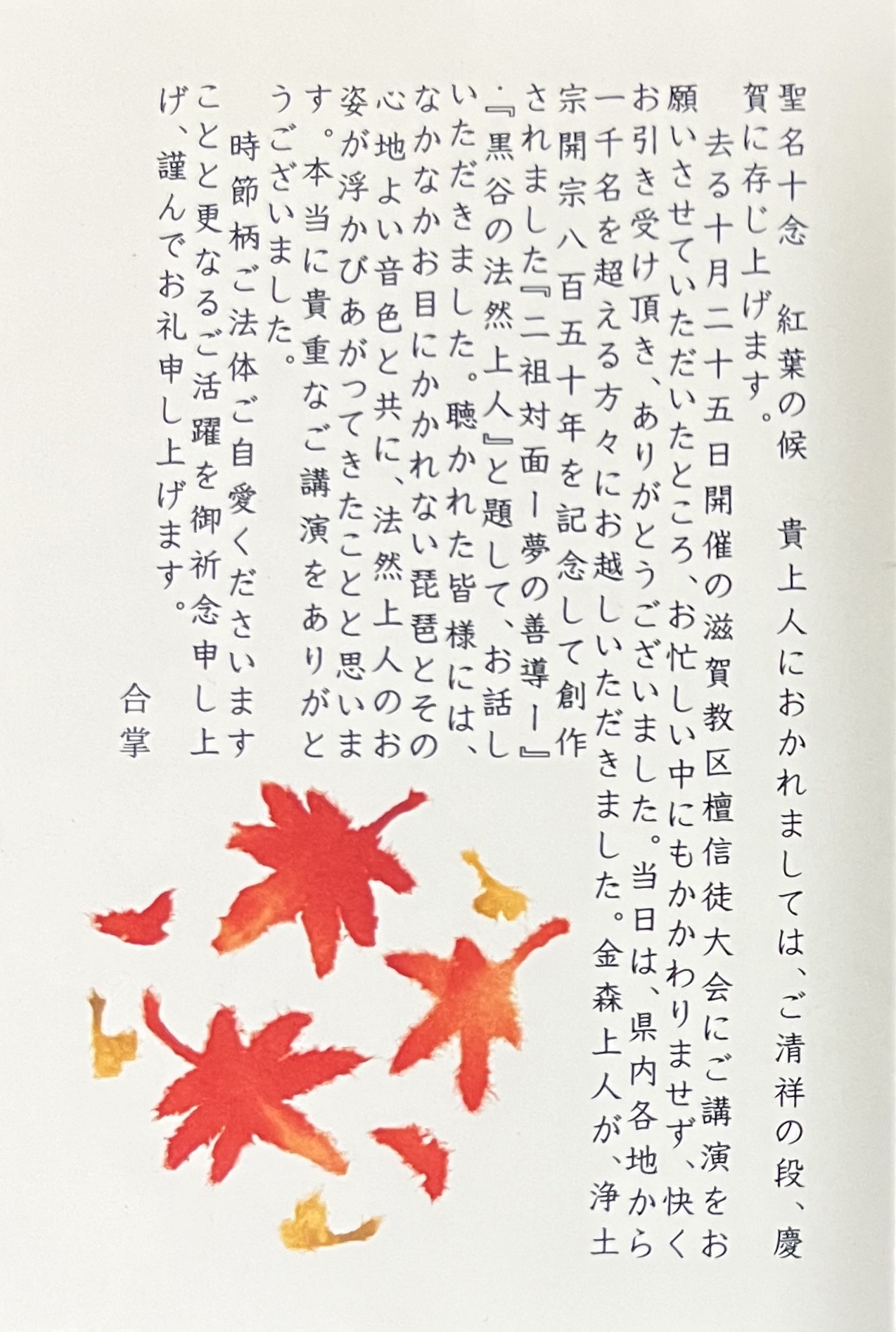 この舞台を支えてくださった実行委員の方々、奉仕を賜ったお上人方、役員の皆様、また聴聞してくださった檀信徒の方々に、心より感謝申し上げます。また、僧侶生活30年あまりの道程の中で、学びを支えてくださった多くの方々にも、深い敬意と感謝を捧げます。合掌